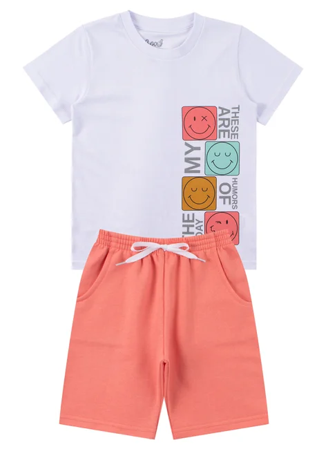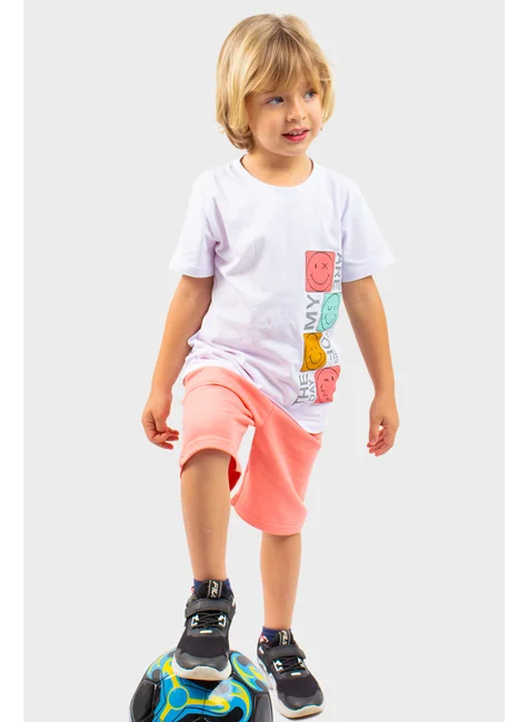 Conjunto Humors White de punto medio para niño , compuesto por dos piezas. Camiseta de punto medio (100 % algodón), cuello redondo y estampado frontal. Bermudas de sudadera (75 % algodón, 25 % poliéster), cinturilla elástica y cordón decorativo frontal, bolsillos frontales funcionales.