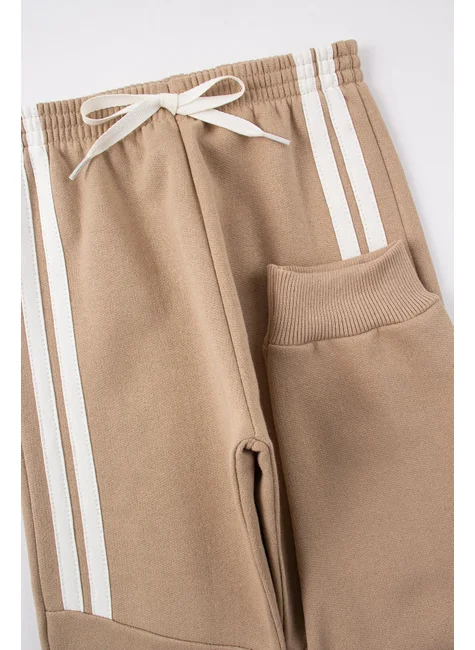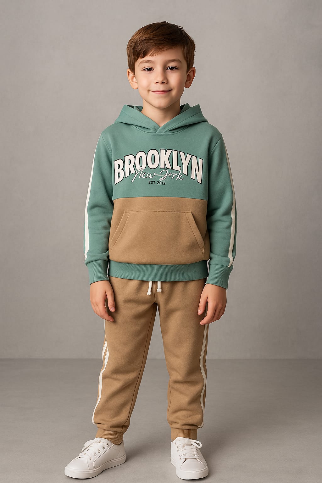 Conjunto de felpa verde Brooklyn Ibiza para niño, compuesto por dos piezas. Moleton de felpa (75 % algodón, 25 % poliéster), cuello redondo con capucha, estampado frontal, abertura frontal con aplique en color de contraste (75 % algodón, 25 % poliéster), mangas con detalles de trenzado lateral en color de contraste, puños y bajo de canalé con aplique en color de contraste. Pantalón de felpa (75 % algodón, 25 % poliéster), cinturilla elástica y cordón decorativo frontal, aberturas frontales con detalles de trenzado en color de contraste y puños de canalé.
