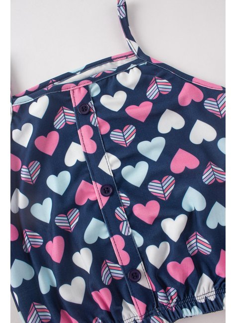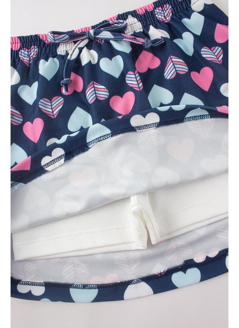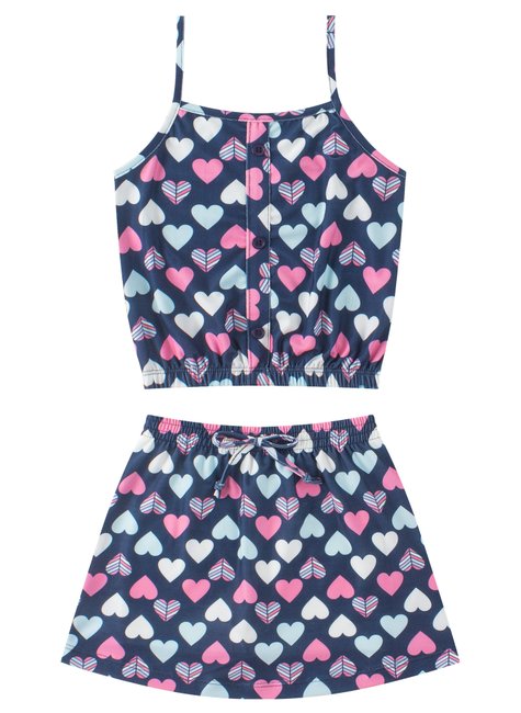 Hermoso Conjunto para Niña Suplex Sublimado Azul Marino compuesto por dos piezas. Blusa confeccionada en suplex sublimado (96% poliéster 4% elastano), cuello cuadrado, tirantes, detalle delantero con aplicación de botones decorativos, bajo elástico. Short pollera confeccionada en suplex sublimado (96% poliéster 4% elastano), cinturilla elástica y aplique decorativo de cordón frontal, short interior confeccionado en suplex (96% poliéster 4% elastano).