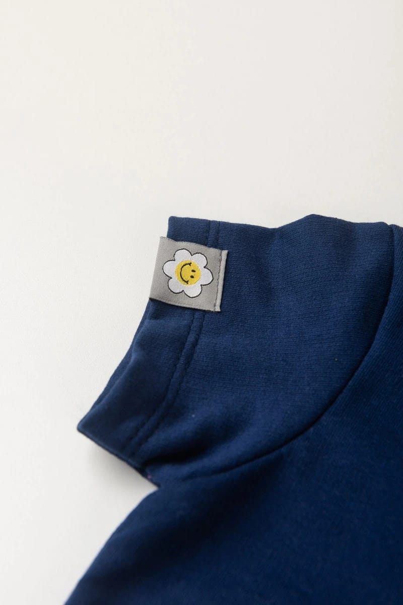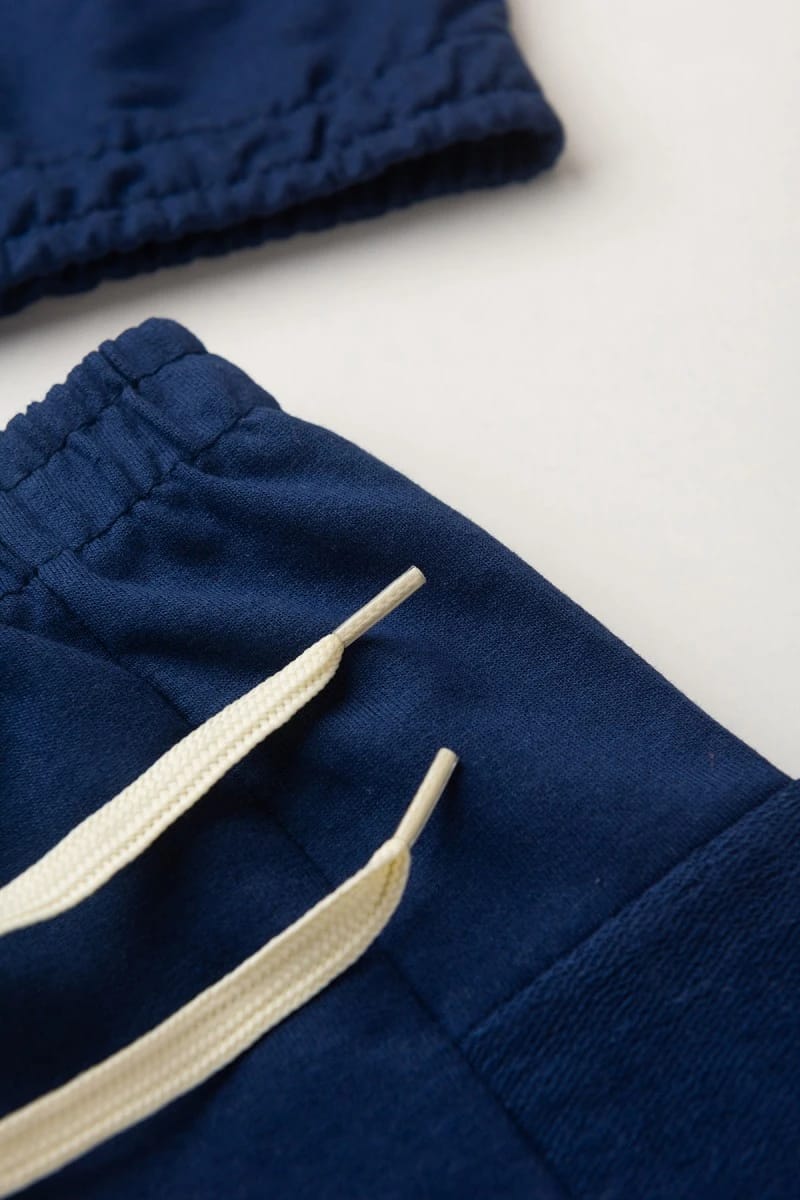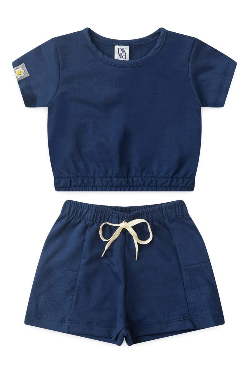 Conjunto de mujer en tejido moleton 50% algodón y 50% poliéster. Crop top en color azul marino con etiqueta decorativa en la manga y short en el mismo color con cordones decorativos súper lindos y detalle en los laterales.