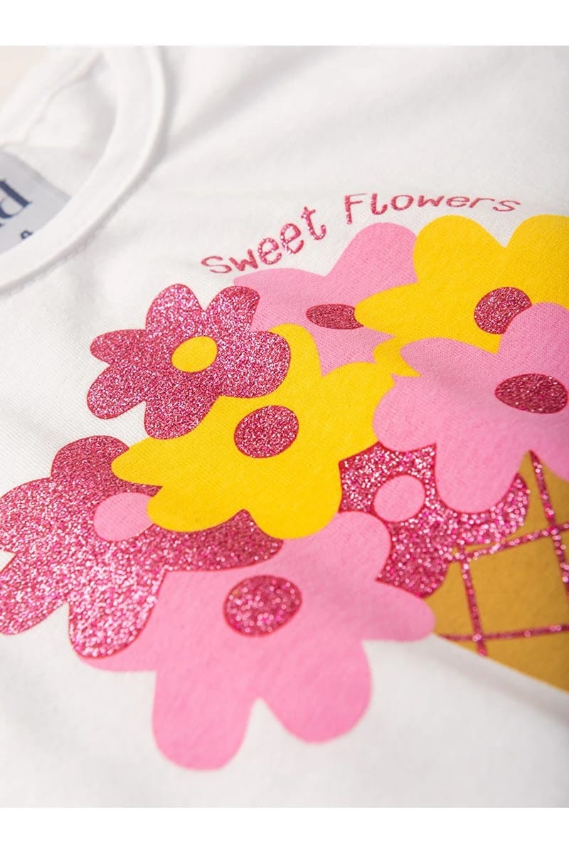 Conjunto de medio punto y moleton súper lindo. Blusa blanca con estampado frontal y volantes en las mangas, short rosa con volantes y cordones decorativos!