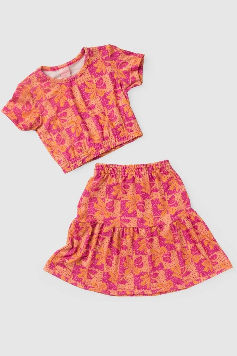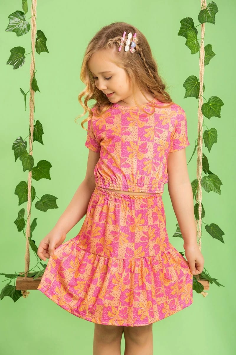 Conjunto en polifléx 96% poliéster y 4% elastano. Top corto con estampado frontal y elástico en la parte inferior, falda con el mismo estampado giratorio ¡súper lindo!