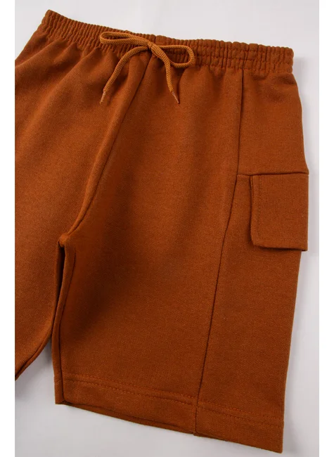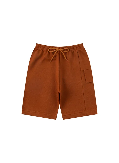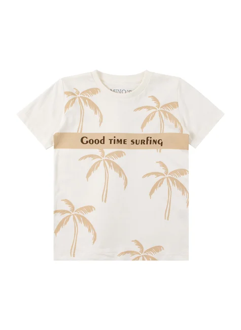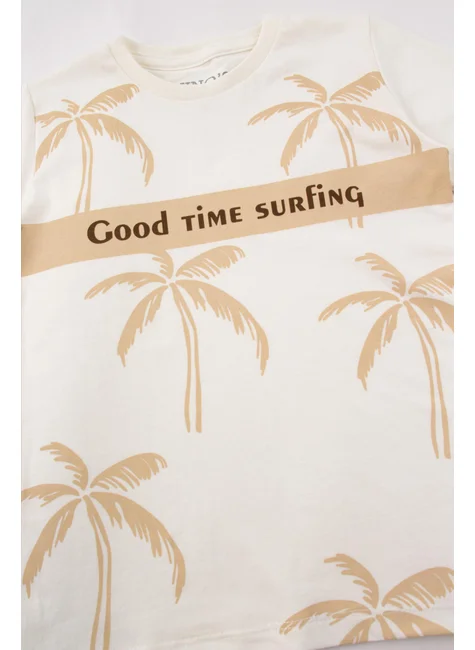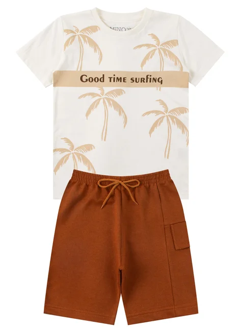 Conjunto de verano blanco de punto medio para niño , compuesto por dos piezas. Camiseta de punto medio (100 % algodón), cuello redondo y estampado frontal. Bermudas de sudadera (75 % algodón, 25 % poliéster), cinturilla elástica y cordón decorativo delantero, con aplique lateral en la solapa falsa.