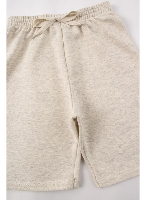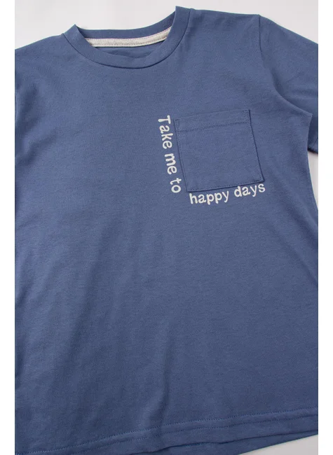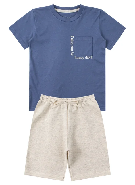 Conjunto de punto medio azul Happy Days para niño , compuesto por dos piezas. Camiseta de punto medio (100 % algodón), cuello redondo, estampado frontal y bolsillo frontal funcional. Bermudas de sudadera (98 % algodón, 0,2 % poliéster), cinturilla elástica y aplique decorativo con cordón ajustable en la parte delantera.