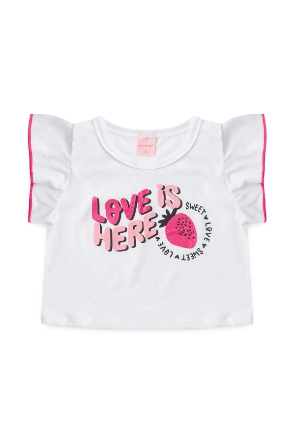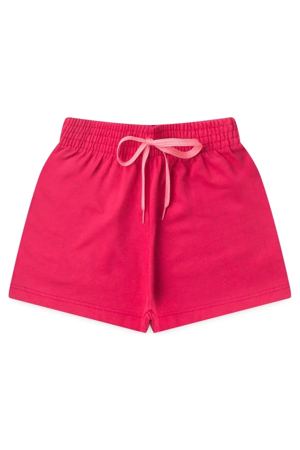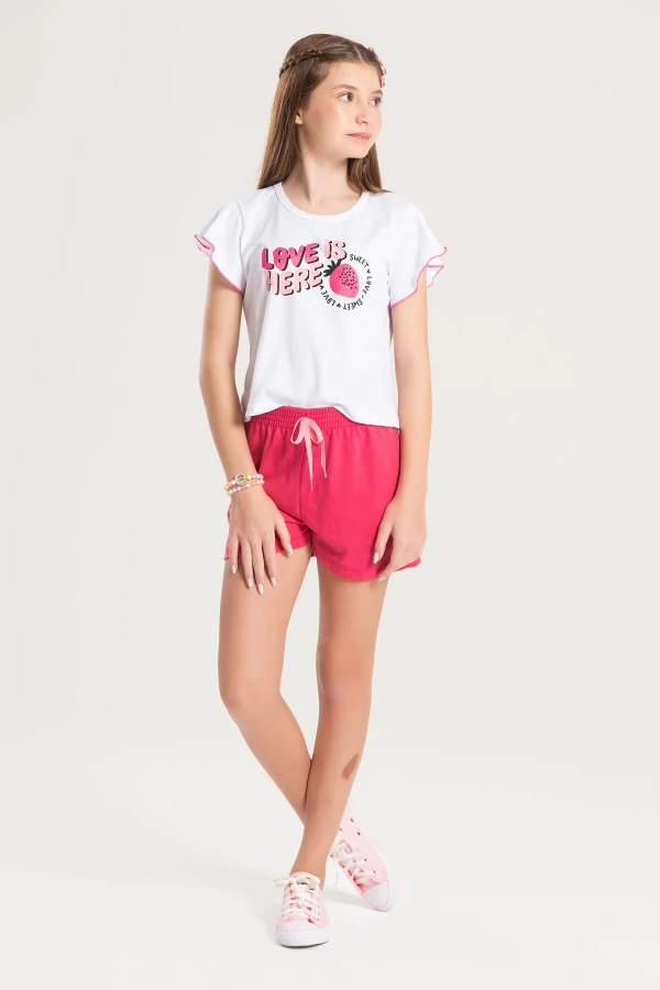Conjunto de dos piezas confeccionado en punto jersey (50 % algodón y 50 % poliéster) y forro polar (60 % algodón y 40 % poliéster). Top corto blanco con estampado frontal y volantes en las mangas, y pantalón corto rosa con un precioso cordón decorativo.