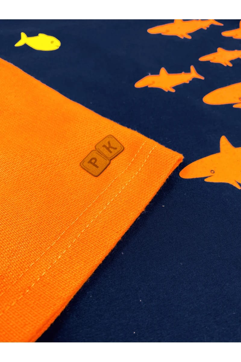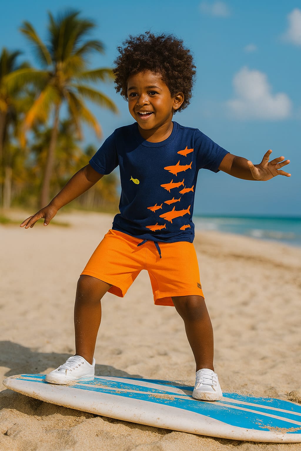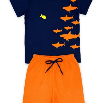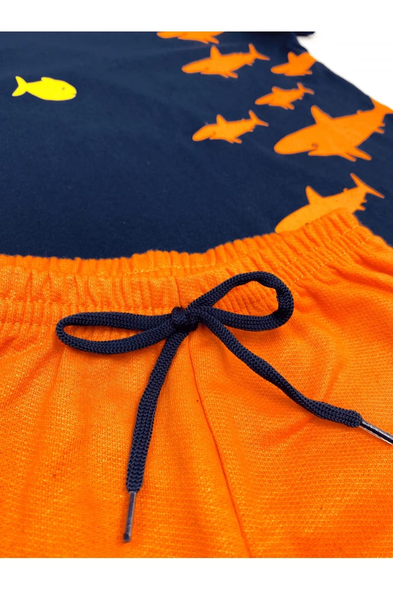 Camiseta azul marino con estampado frontal y pantalón corto naranja con cordones decorativos.