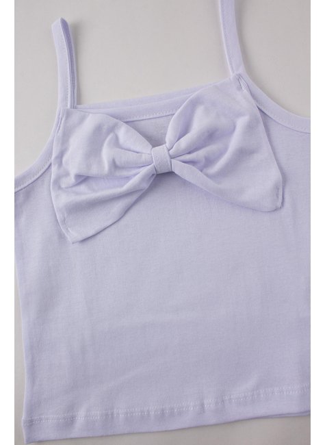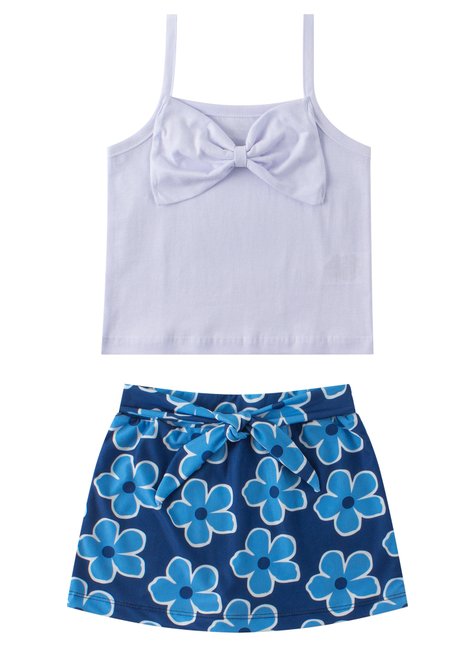 Conjunto Sublimado de Malla/Suplex de Color Blanco compuesto por dos piezas. Blusa confeccionada en media malla (100% algodón), cuello cuadrado, tirantes, detalle delantero con aplique de lazo decorativo.