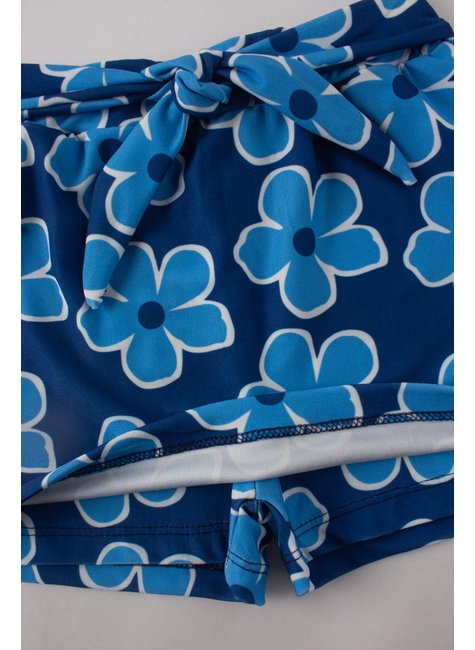 Shorts pollera confeccionada en suplex sublimado (96% poliéster 4% elastano), cinturilla elástica y detalle de lazo frontal, superposición delantera.