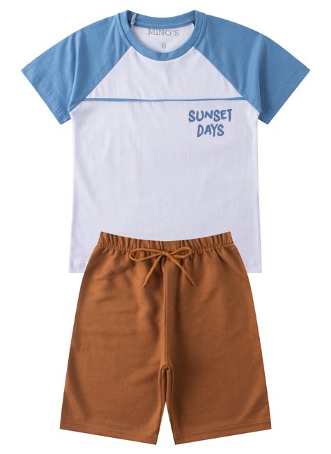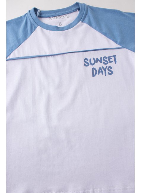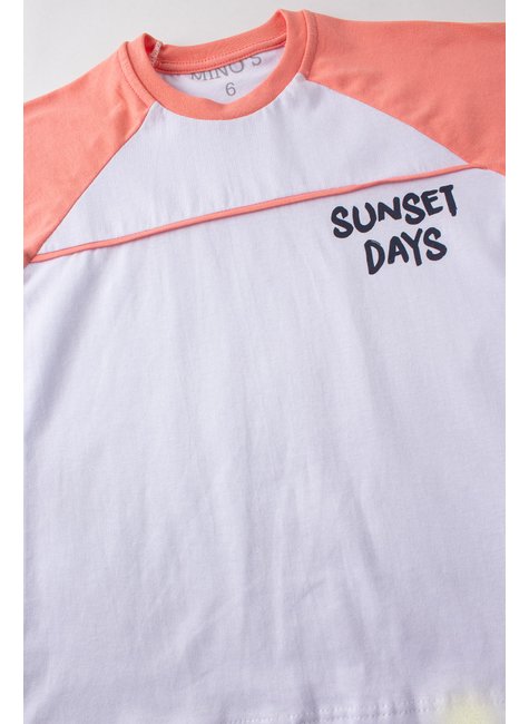 Conjunto Sunset Days Coral compuesta por dos piezas. Camiseta confeccionada en media malla (100% algodón), cuello redondo con aplicación de color en contraste, estampado frontal.