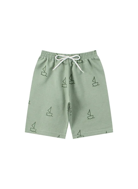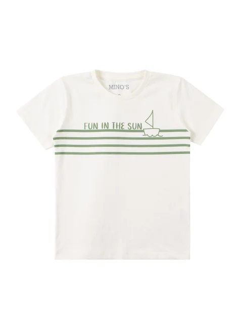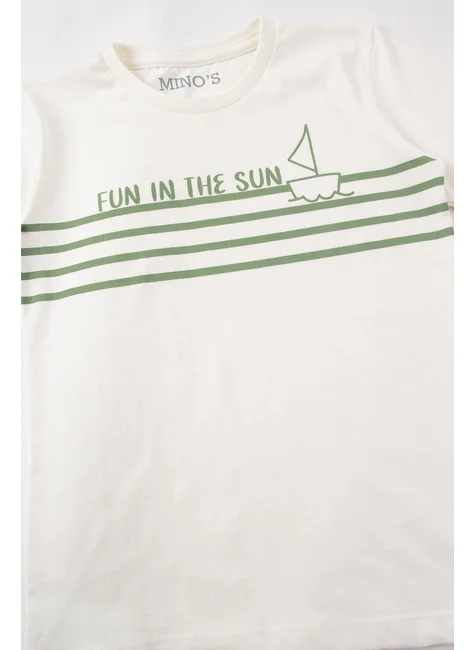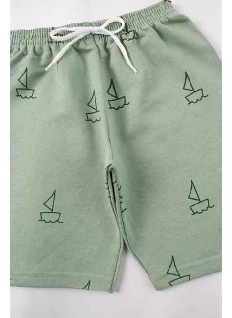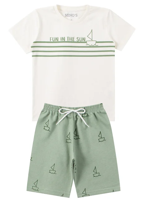 Conjunto de verano de punto para niño , compuesto por dos piezas. Camiseta de punto (100 % algodón), cuello redondo y estampado frontal. Bermudas de sudadera estampada (75 % algodón, 25 % poliéster), cinturilla elástica y cordón decorativo frontal.