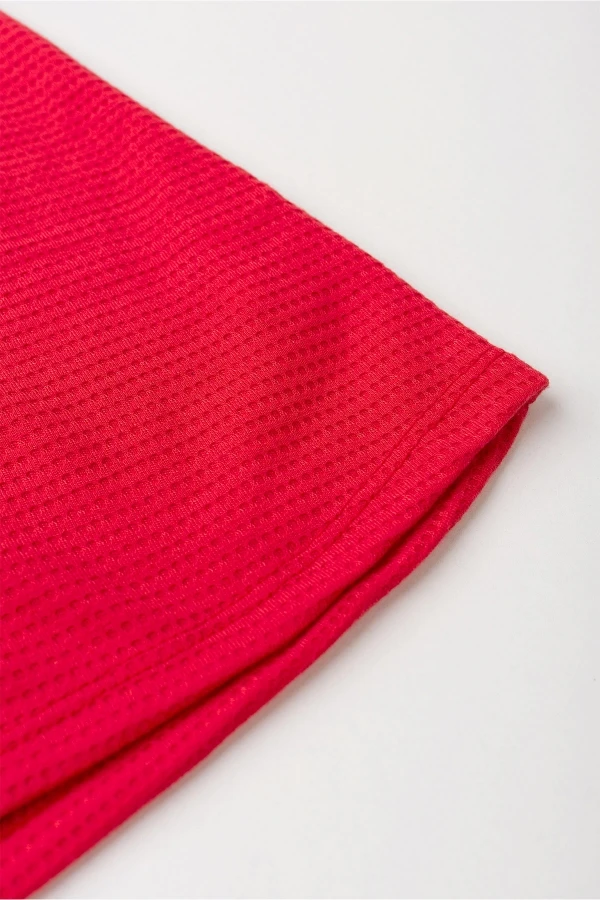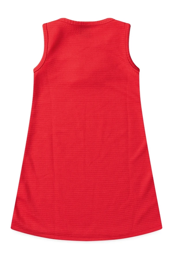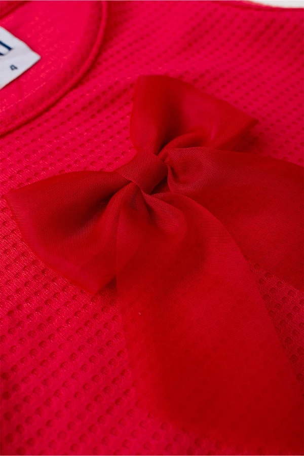 Hermoso vestido en 100% poliéster seersucker. De color rojo y con un lazo decorativo en la parte delantera, ¡perfecto para que tu princesita brille este verano!