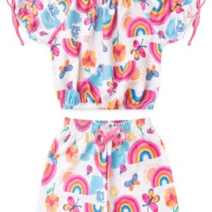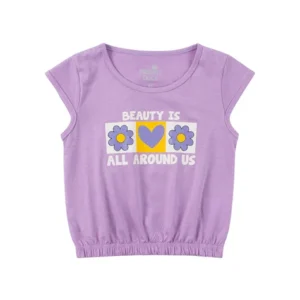 Conjunto de verano para niña de malla sublimado color lila, compuesto por dos piezas. Blusa de malla (100 % algodón), cuello redondo, estampado frontal con detalle de purpurina y bajo elástico. Falda corta de suplex sublimado (96 % poliéster, 4 % elastano), cinturilla elástica y aplique frontal de cordón decorativo, superposición frontal.