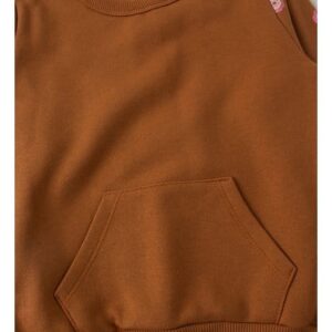 Conjunto infantil para niña, color Caramelo, compuesto por dos piezas. Buzo confeccionada en tejido de moleton afelpado (75% algodón 25% poliéster), cuello redondo de canalé, bolsillo frontal funcional, mangas con detalles estampados y ribete fruncido, puños y bajo de canalé. Pantalón confeccionado en tejido moleton afelpado (75% algodón 25% poliéster), cinturilla elástica, puños acanalados.