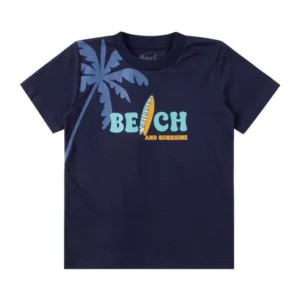 Conjunto de punto medio azul marino para niño , compuesto por dos piezas. Camiseta de punto medio (100 % algodón), cuello redondo y estampado frontal. Bermudas Saruel de sudadera (75 % algodón, 25 % poliéster), cinturilla elástica y cordón decorativo frontal, estampado frontal en una pierna.