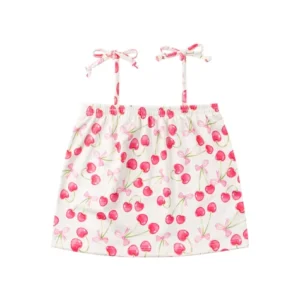 Conjunto de sudadera de cereza rosa para niña, compuesto por dos piezas. Blusa sin tirantes de suplex sublimado (96 % poliéster, 4 % elastano), tirantes con cierre de lazo, cuello y bajo elásticos. Falda corta de sudadera (75 % algodón, 25 % poliéster), cinturilla elástica y aplique frontal de cordón decorativo, solapa frontal.