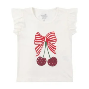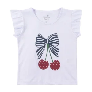 Conjunto de niña de media suplex sublimado en blanco cereza compuesto por dos piezas. Blusa de media malla (100 % algodón), cuello redondo, estampado frontal con aplique de pedrería y mangas fruncidas. Falda y pantalón corto de suplex sublimado (96 % poliéster, 4 % elastano), cinturilla elástica y aplique frontal de cordón decorativo. Pantalón corto interior de media malla (100 % algodón) con volante.