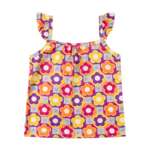 Conjunto de sudadera de suplex floral colorido para niña , compuesto por dos piezas. Blusa de suplex sublimado (96 % poliéster, 4 % elastano), tirantes con aplique de volante. Falda corta de sudadera (75 % algodón, 25 % poliéster), cinturilla elástica y aplique frontal de cordón decorativo, con solapa frontal.
