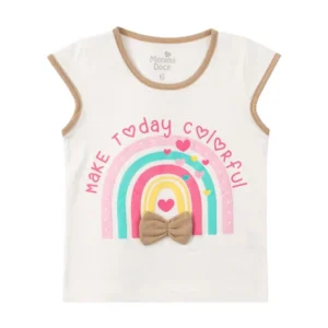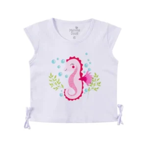 Conjunto 100 % algodón para que tu pequeña luzca espectacular. Blusa blanca con un delicado estampado frontal y shorts azules con una capa superpuesta y un nudo decorativo.