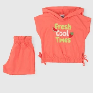 Conjunto de punto natural colorido para niña, compuesto por dos piezas. Blusa de punto (100 % algodón), cuello redondo con aplique en color de contraste, estampado frontal con detalle de relieve abullonado, aplique de lazo frontal de tela de sudadera (75 % algodón, 25 % poliéster), mangas con aplique en color de contraste. Pantalón corto de tela de sudadera (75 % algodón, 25 % poliéster), cinturilla elástica con cordón ajustable decorativo frontal, perneras con pespunte.