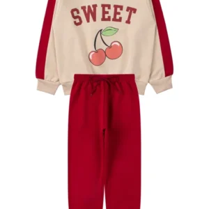 Conjunto para niño, compuesto por dos piezas. Moleton de felpa sublimada (75 % algodón, 25 % poliéster), cuello redondo acanalado con aplique en color contrastante, abertura frontal con aplique y estampado en color contrastante, bolsillo frontal funcional, puños y bajo acanalados. Pantalón de felpa (75 % algodón, 25 % poliéster), cinturilla elástica con cordón decorativo en la parte delantera y puños acanalados.