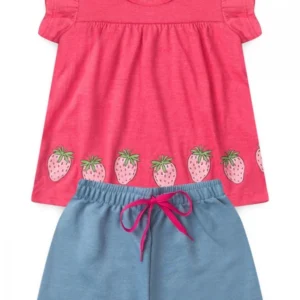 Conjunto de punto jersey súper mono (50 % algodón y 50 % poliéster) y polar (60 % algodón y 40 % poliéster). Top rosa con estampado frontal y volantes en las mangas, y shorts azules con un precioso cordón decorativo.