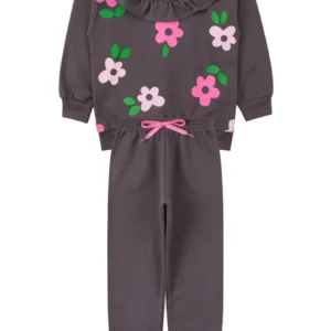 Conjunto de felpa para niña con flores de plomo, compuesto por dos piezas. Moleton de felpa (75 % algodón, 25 % poliéster), cuello redondo acanalado, volante delantero, estampado frontal, puños y bajo acanalados. Pantalón de felpa (75 % algodón, 25 % poliéster), cinturilla elástica, cordón decorativo delantero y puños acanalados.