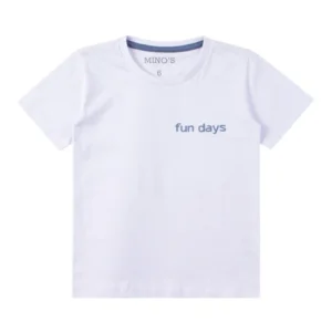 Conjunto de dos piezas de jersey Fun Days blanco para niño . Camiseta de jersey (100 % algodón), cuello redondo y estampado frontal con detalle de relieve abullonado. Bermudas de sudadera (75 % algodón, 25 % poliéster), cinturilla elástica y cordón decorativo frontal, y bolsillos falsos delanteros.