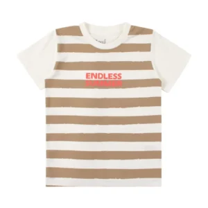 Conjunto infantil Endless Summer Natural , compuesto por dos piezas. Camiseta de jersey (100 % algodón), cuello redondo y estampado frontal. Bermudas de sudadera (75 % algodón, 25 % poliéster), cinturilla elástica acanalada y cordón decorativo frontal, con solapa falsa y botón decorativo.