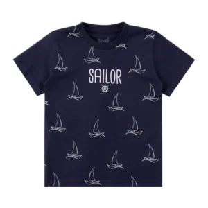 Camiseta azul de media malla con estampado frontal y pantalón corto en estampado mixto tactel y falso lazo