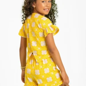 Conjunto de jersey 50 % algodón y 50 % poliéster. Blusa amarilla con estampado giratorio, mangas con volantes y abertura en la espalda. Pantalones cortos del mismo color y estampado con volantes en el bajo y encaje decorativo.