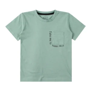 Conjunto de punto medio Happy Days Green Ibiza para niño , compuesto por dos piezas. Camiseta de punto medio (100 % algodón), cuello redondo, estampado frontal y bolsillo frontal funcional. Bermudas de sudadera (75 % algodón, 25 % poliéster), cinturilla elástica y aplique decorativo con cordón ajustable en la parte delantera.