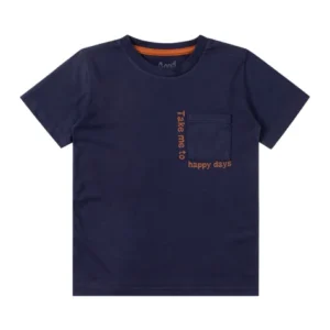 Conjunto de dos piezas, Happy Days azul marino para niño . Camiseta de jersey (100 % algodón), cuello redondo, estampado frontal y bolsillo frontal funcional. Bermudas de sudadera (75 % algodón, 25 % poliéster), cinturilla elástica y aplique decorativo con cordón ajustable en la parte delantera.