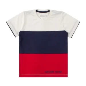 Conjunto de dos piezas Never Stop Natural para niño . Camiseta de punto 100 % algodón, cuello redondo, paneles frontales con aplicaciones y estampados en color contrastante, mangas con ribete en color contrastante. Bermudas de tela sudadera (75 % algodón, 25 % poliéster), cinturilla elástica con cordón decorativo frontal y bolsillos falsos delanteros.